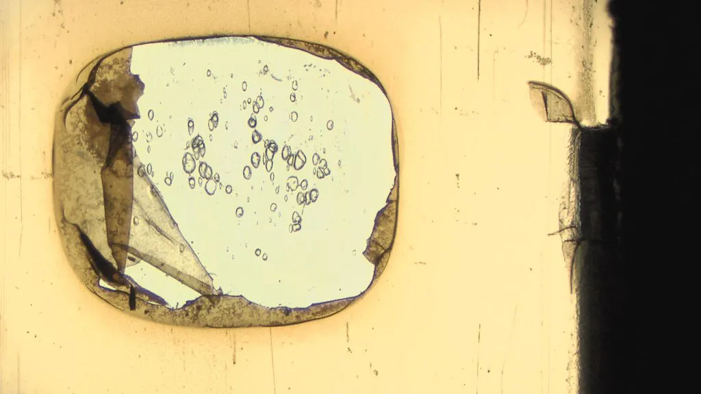 The heat from the light source eventually burned a hole right through the film. If your films have these holes, you'll see an odd sight quickly pass by when viewing your transfer. It will be a bright white spot if the film was burned all the way through. Or, it will appear darker and all bubbly, if the film's emulsion nearly got burnt to a crisp.