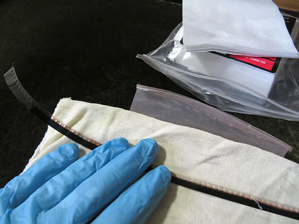 Nei nostri 13 anni di esperienza, abbiamo notato che tutti i film traggono vantaggio dalla pulizia, anche quelli appena usciti dal laboratorio! Molti film non richiedono cure particolari, una pulizia a mano accurata è sufficiente. Altri film, seppur rari, richiedono una soluzione costosa per film chiamata "FilmRenew" (non mostrata qui).